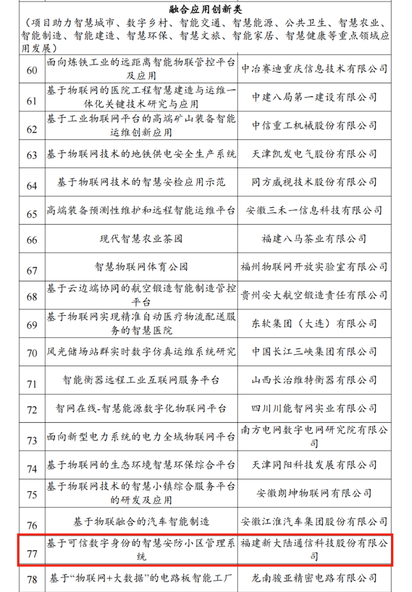 ????近日,工信部公示“2021年物聯網示范項目”名單。新大陸通信公司“基于可信數字身份的智慧安防小區管理系統”入選“融合應用創新類項目”。