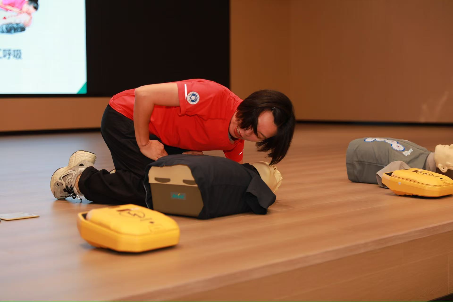 ????在實景模擬環節,通信公司參訓人員逐一上前,在教練指導下利用人體模型進行實操練習,將所學知識付諸實踐。每一個按壓都在為“會用”打底,每一次模擬都在為“敢用”蓄力。